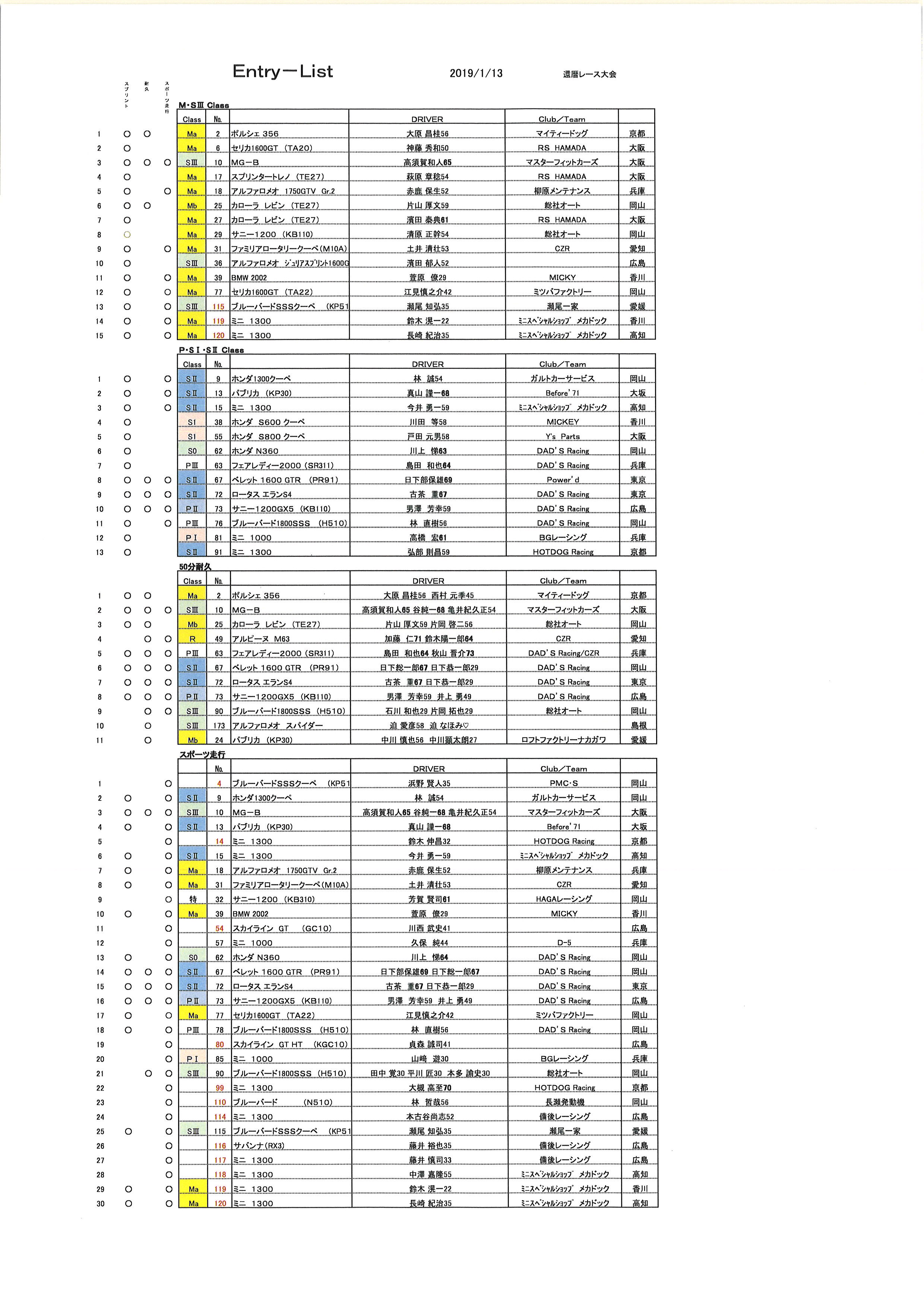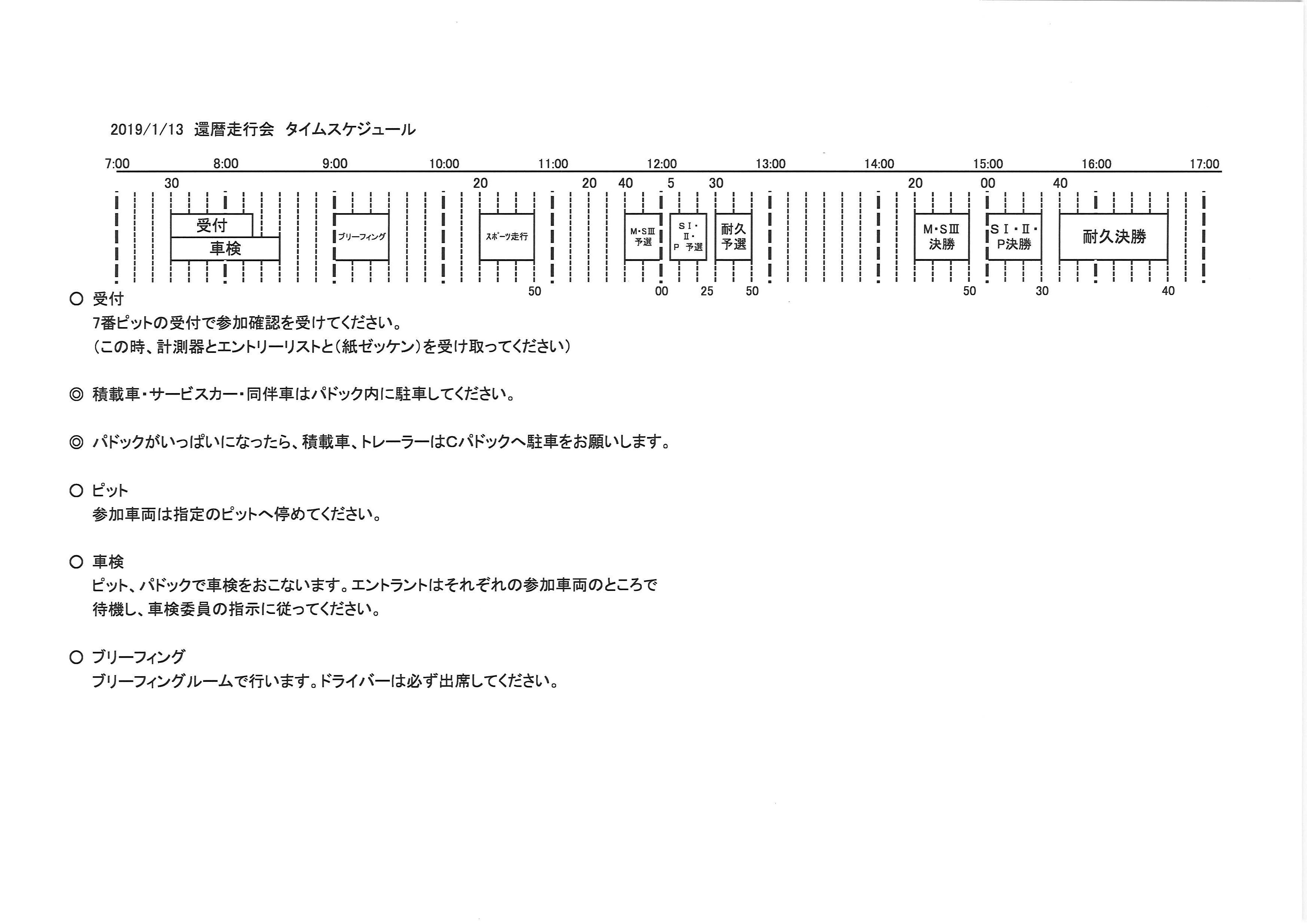 2019年1月10日 / 最終更新日時 : 2019年1月10日 jimukyoku 事務局からのお知らせ 2019/1/13還暦走行会 最新情報 皆様お待たせ致しました。 エントリーリスト、ピット割、タイムスケジュールのお知らせです。 当日の雨の心配はなさそうですので、ドライで思いっ切り走れそうです。 新年の走り初め、楽しみましょう!